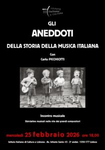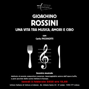 Il primo incontro del ciclo, tenuto da Carlo Picchiotti, è dedicato al grande compositore pesarese, impareggiabile autore dell’opera buffa, e gran gourmet della cucina italiana in Europa. Lunedì, 2 febbraio 2026, ore 18.00 Istituto Italiano di Cultura di Lisbona Av. Infante Santo, 43 – 2º – Lisbona Posti limitati. Prenotazione obbligatoria alla mail: iiclisbona.reservas@esteri.it Durante l’incontro si […]