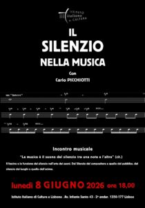Il quarto incontro del ciclo, tenuto da Carlo Picchiotti, è dedicato al fascino e alla funzione del silenzio nell’arte dei suoni. Lunedì, 8 giugno 2026, ore 18.00 Istituto Italiano di Cultura di Lisbona Av. Infante Santo, 43 – 2º – Lisbona Posti limitati. Prenotazione obbligatoria alla mail: iiclisbona.reservas@esteri.it Il silenzio è uno dei più importanti elementi a […]