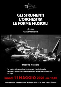 Il terzo incontro del ciclo, tenuto da Carlo Picchiotti, è dedicato all’Orchestra sinfonica, dalle sue origini sino al suo attuale organico. Lunedì, 11 maggio 2026, ore 18.00 Istituto Italiano di Cultura di Lisbona Av. Infante Santo, 43 – 2º – Lisbona Posti limitati. Prenotazione obbligatoria alla mail: iiclisbona.reservas@esteri.it Durante l’incontro verrà esaminata la simbologia dei singoli strumenti […]