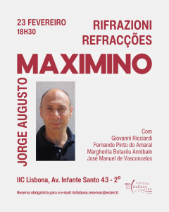 Presentazione del libro di poesie “Rifrazioni / Refracções” (2025, Molesini Editore Venezia), alla presenza dell’autore Jorge Augusto Maximino, promosso dall’Istituto Italiano di Cultura di Lisbona. Lunedì, 23 febbraio 2026, ore 18.30 Istituto Italiano di Cultura di Lisbona Av. Infante Santo, 43 – 2º – Lisbona Posti limitati. Prenotazione obbligatoria alla mail: iiclisbona.reservas@esteri.it Intervengono: – Fernando […]