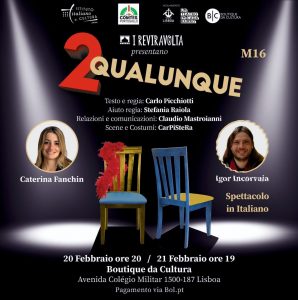 Spettacolo teatrale “Due Qualunque” della Compagnia I REVIRAVOLTA, con il sostegno dell’Istituto Italiano di Cultura di Lisbona e del COMITES Portogallo. Venerdì, 20 febbraio 2026, ore 20.00 Sabato, 21 febbraio 2026, ore 19.00 Boutique da Cultura Av. do Colégio Militar, 1500-187 – Lisbona Biglietti acquistabili tramite la piattaforma BOL (link a breve) o presso la […]