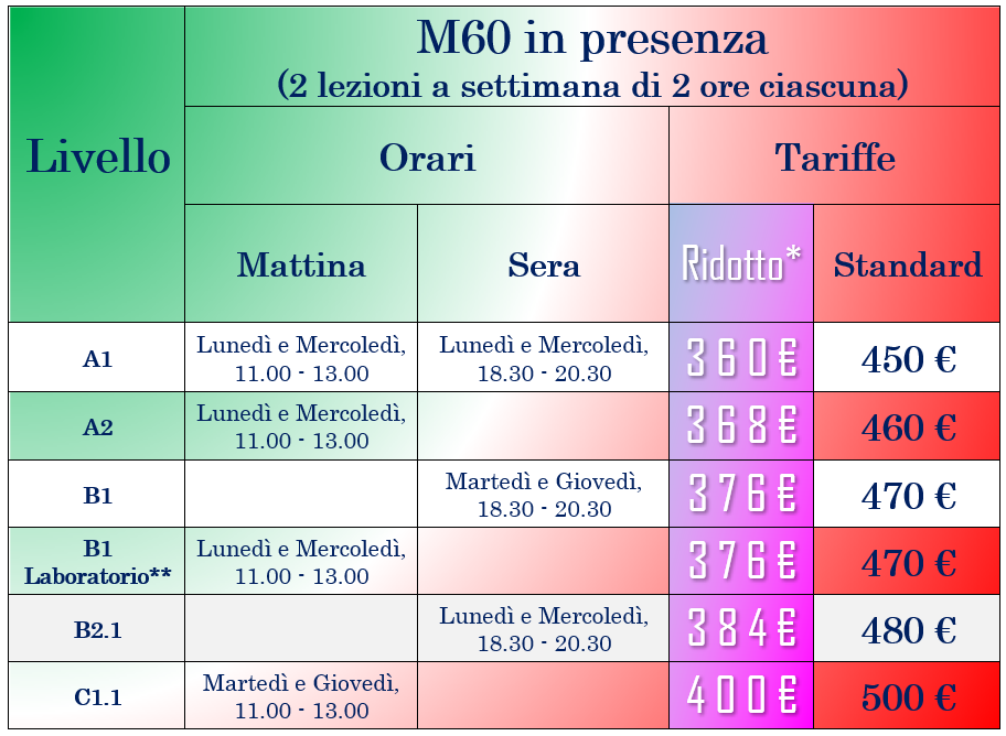 (**): B1 M60 LABORATORIO – Corso speciale (in presenza)