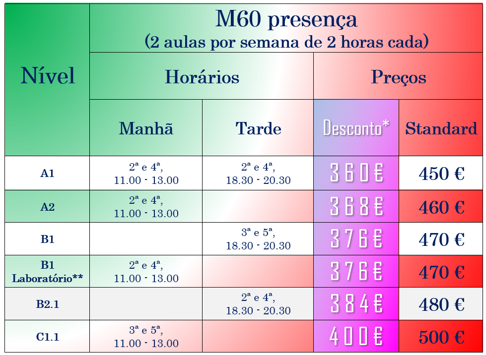 Queres reforçar o teu nível B1 de forma prática, dinâmica e eficaz? O curso B1 M60 LABORATÓRIO do IIC Lisboa é uma proposta especial concebida para quem pretende consolidar e treinar as competências linguísticas do nível B1, através de atividades orientadas, exercícios específicos e prática comunicativa. Um percurso ideal para ganhar confiança no uso da língua e melhorar a fluência, a correção e a autonomia.